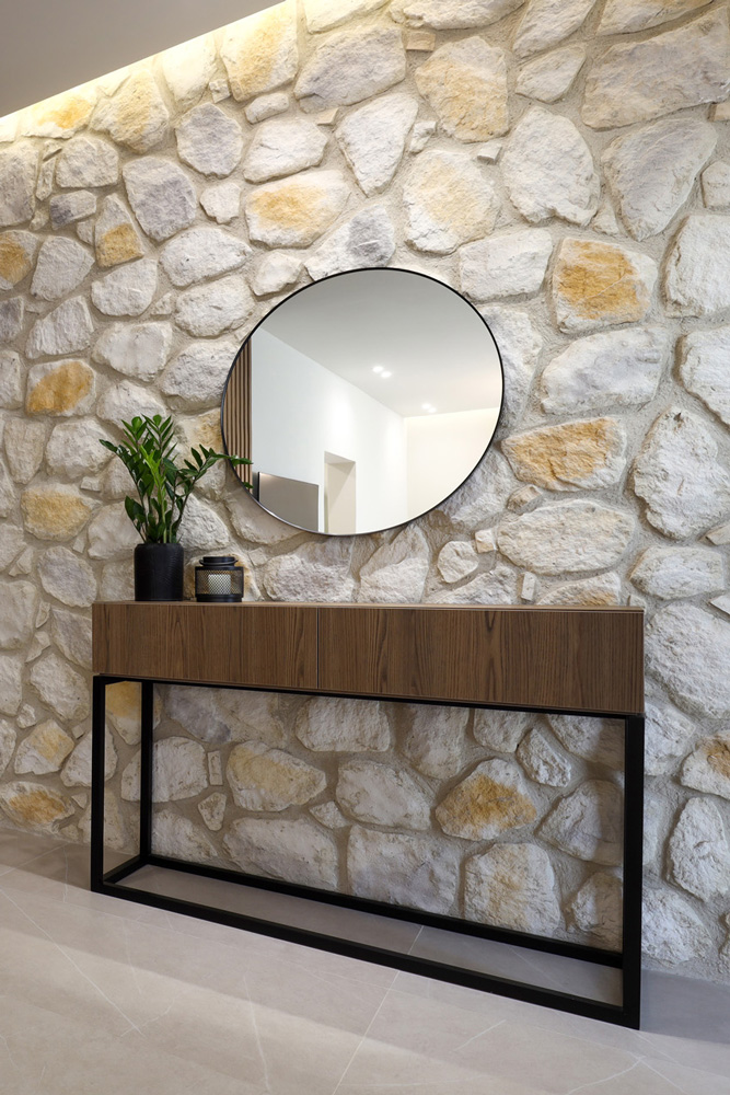 Durch die Fugenverlegung entsteht ein harmonisches Gesamtbild – von ländlich-rustikal bis alpin oder historisch. Besonders gut eignet sich Fieldstone für Fassaden, Wintergärten, Haussockel sowie für Kamin- und Wohnzimmerwände.
